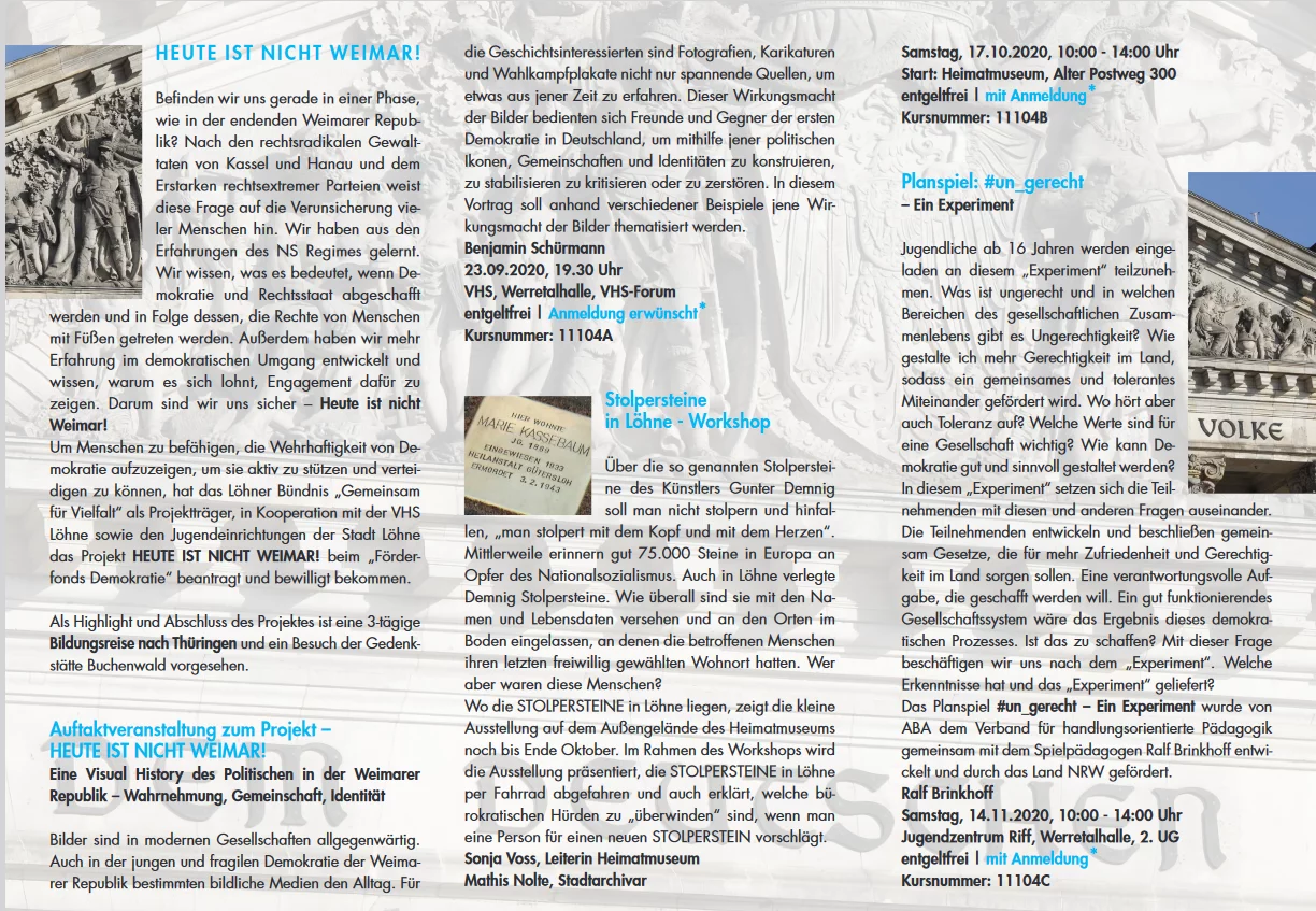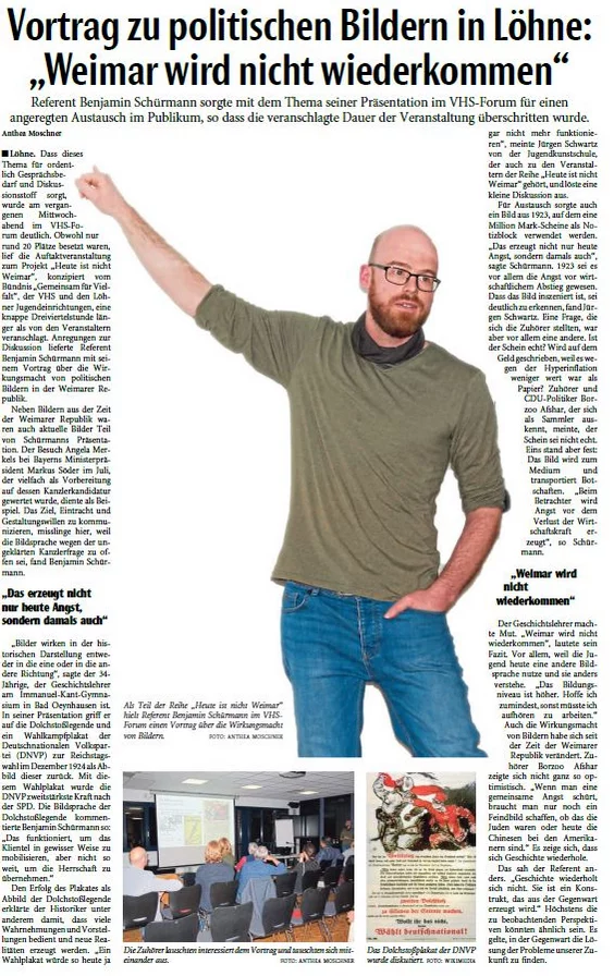 Am 23.09.2020 „Heute ist nicht Weimar! Eine Visual History des Politischen in der Weimarer Republik – Wahrnehmung, Gemeinschaft Identität“. Ein Vortrag von Benjamin Schürmann als Auftaktveranstaltung zur Veranstaltungsreihe „Heute ist nicht Weimar!“, im VHS-Forum in der Löhner Werretalhalle.