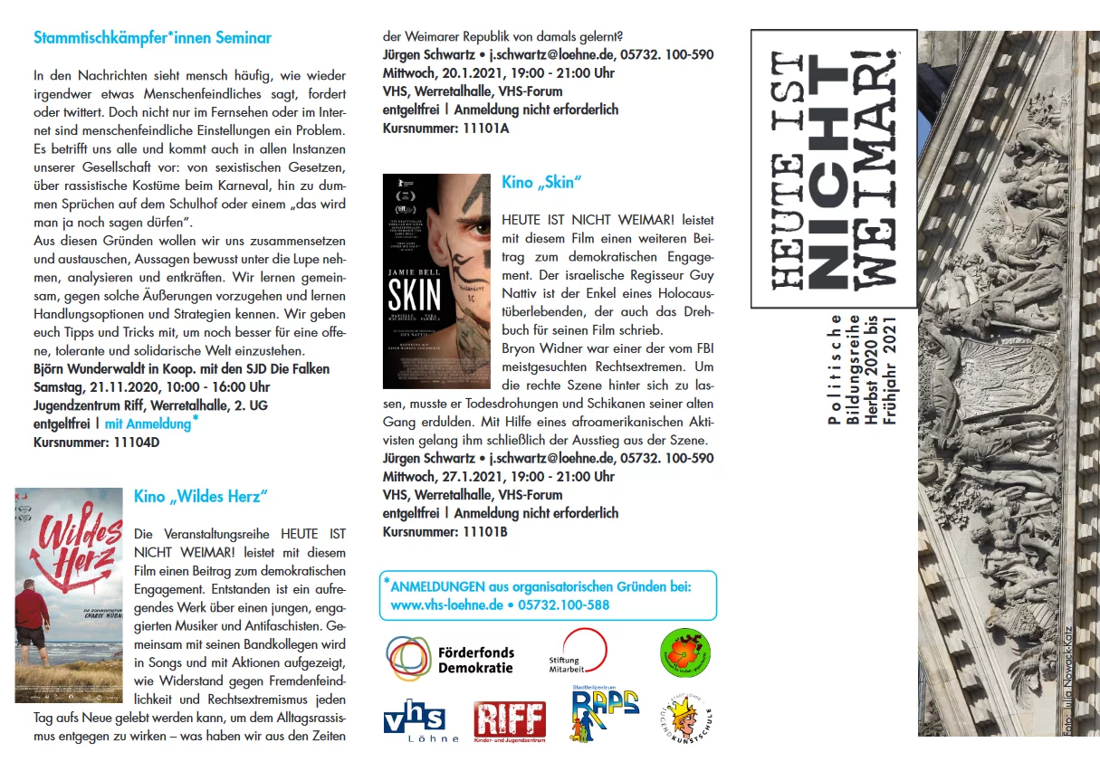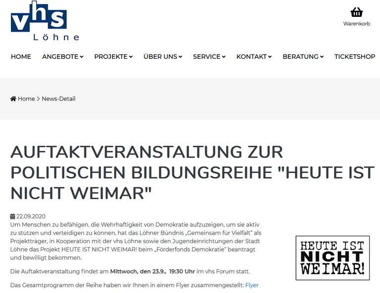 Um (junge) Menschen zu befähigen, unsere Demokratie aktiv zu stützen und verteidigen zu können, hat das Löhner „Bündnis Gemeinsam für Vielfalt“ als Projektträger in Kooperation mit der VHS Löhne sowie den Jugendeinrichtungen der Stadt Löhne Mittel beim Förderfonds Demokratie eingeworben, die zur Durchführung der Veranstaltungsreihe „Heute ist nicht Weimar!“ genutzt wurden.