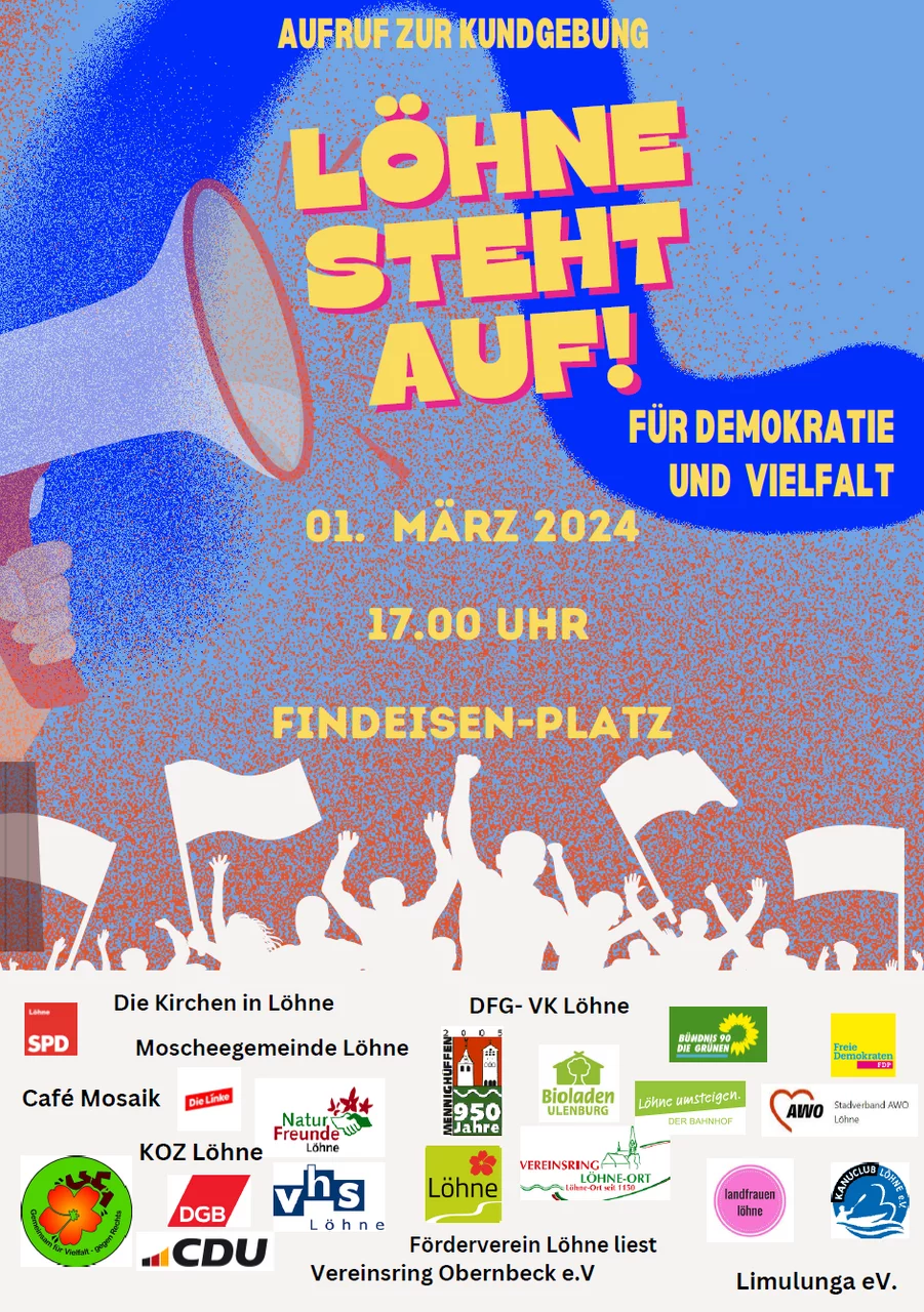 Das Löhner Bündnis Gemeinsam für Vielfalt rief in Folge des Bekanntwerdens der Berichterstattung des Recherchekollektivs Correctiv zu einem geheimen Treffen von Politikern, Unternehmern und Rechtsextremen in Potsdam, am 24.01.2024 dazu auf, an der Demo „Alle gegen Rechts“ am 26.01.2024 auf dem Rathausplatz in Herford teilzunehmen.