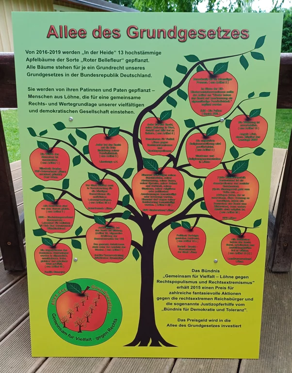 Wir haben nun am 14. Juni 2024 an der Allee des Grundgesetzes ein Hinweisschild angebracht, dass die Geschichte der Allee erläutert und somit auf die Bedeutung der Bäume hinweist.